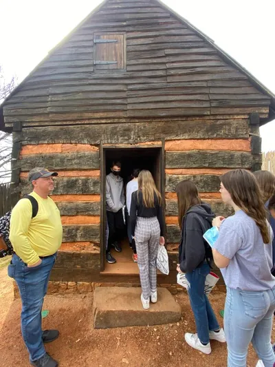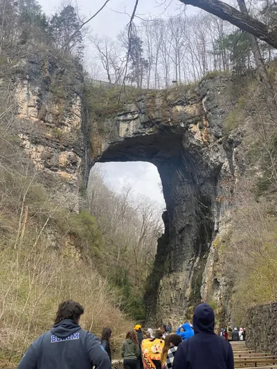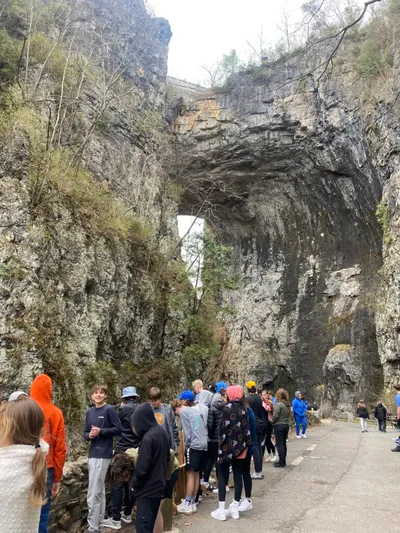 Today dawned bright and early. Students and staff grabbed a quick bite and boarded the buses home. It has been a wonderful week learning and growing together. New friendships formed, old friendships deepened. Our last stop for learning was the Natural Bridge in Rockbridge County, Virginia. The 215-foot tall Natural Bridge is a limestone gorge carved out by Cedar Creek. It was once owned by Thomas Jefferson, who sold the bridge for around $160. It was a cold, snowy (yes SNOW) walk down into the gorge, but worth the views once we arrived.