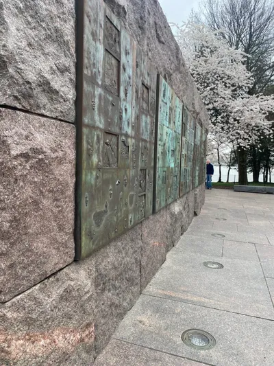 Our next stop was the Tidal Basin. Coming to D.C. during the peak week for cherry blossoms is just an added bonus. The basin really put on a show for us today! The group began at Thomas Jefferson’s memorial for a few quick photos. We then walked to FDR and walked through this interesting memorial of his life which included a memorial to his wife as well. We continued through the cherry blossoms to the MLK Memorial. There is something so breathtaking about coming around the trees and seeing this memorial. Our students were so well behaved and took the time to really honor these men. It was a long, cold walk, but oh so worth it.